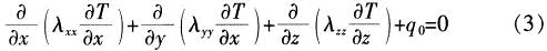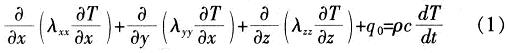 式中:T/x,T/y,T/z為沿x,y,z方向的溫度梯度;λxx,λyy,λzz為熱導率;q0為單位體積的熱生成;ρc是密度與比熱容的乘積:dT/dt為溫度隨時間的變化率。