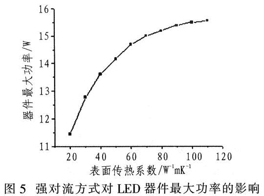 常見對流散熱方式有兩種:自然對流和強製對流。固定結構的散熱與表麵傳熱係數有關。空冷方式時,不同傳熱係數對最大功率的影響如圖5所示。強對流方式在一定速度內會大大提高LED產品的散熱能力,有助於提高散熱效果。