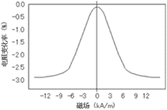 AMR單體是用鎳和鐵等製成的強磁性金屬合金。一般采用矽(Si)製成,當遇到施加的電流方向垂直的磁場時,阻抗值發生變化。這個現象就稱為磁阻效應,特性如圖1所示。它以0(零)H為軸,正負兩側對稱的特性,因此是不區別磁鐵的N極和S極的兩極檢測。