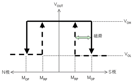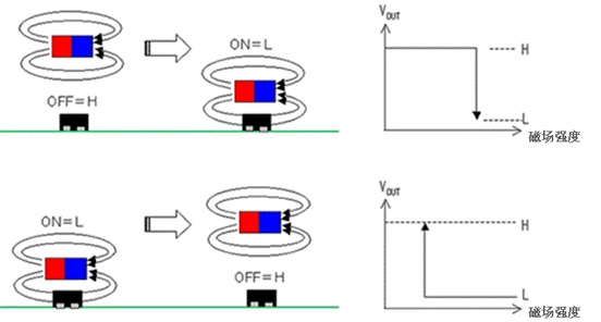 AS係列能夠通過磁鐵和傳感器之間的距離改變來檢測出磁通密度的變化,控製傳感器輸出信號的開關(高(H)<=>低(L)),如圖5所示。當磁鐵接近傳感器,使磁場的強度變大,則傳感器的輸出就會由“高”變“低”,反之則由“低”變“高”。