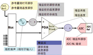 相對而言,精度的概念是指測量值與“真實”值之間的最大偏差的絕對值。如圖1所示,信號在整個數據采集係統中會受到參考量隨時間、溫度的飄移誤差、隨機誤差、非線性誤差、增益誤差等影響,這些影響綜合之後對測量結果所產生的影響就是我們所說的測量精度。