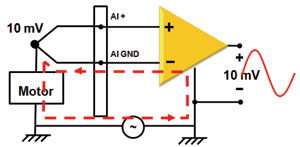 接地環路會嚴重影響測試結果,例如,在圖4所(suo)示(shi)的(de)電(dian)路(lu)中(zhong),為(wei)了(le)能(neng)夠(gou)長(chang)時(shi)間(jian)監(jian)測(ce)一(yi)個(ge)電(dian)機(ji)的(de)溫(wen)度(du),在(zai)電(dian)機(ji)上(shang)連(lian)上(shang)一(yi)個(ge)熱(re)電(dian)偶(ou)傳(chuan)感(gan)器(qi),由(you)於(yu)電(dian)機(ji)箱(xiang)是(shi)接(jie)地(di)的(de),因(yin)此(ci)熱(re)電(dian)偶(ou)也(ye)接(jie)地(di),而(er)數(shu)據(ju)采(cai)集(ji)設(she)備(bei)地(di)與(yu)電(dian)機(ji)箱(xiang)地(di)之(zhi)間(jian)存(cun)在(zai)電(dian)勢(shi)差(cha),因(yin)此(ci)產(chan)生(sheng)了(le)電(dian)流(liu)。你(ni)可(ke)以(yi)注(zhu)意(yi)到(dao),加(jia)在(zai)測(ce)試(shi)信(xin)號(hao)的(de)噪(zao)聲(sheng)可(ke)能(neng)是(shi)交(jiao)流(liu)的(de),或(huo)者(zhe)一(yi)個(ge)簡(jian)單(dan)的(de)直(zhi)流(liu)偏(pian)移(yi)值(zhi),但(dan)最(zui)終(zhong)無(wu)可(ke)避(bi)免(mian)地(di)影(ying)響(xiang)了(le)測(ce)試(shi)精(jing)度(du)。