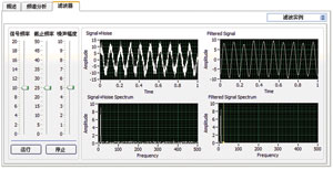 圖6就是使用NILabVIEW圖形化開發平台實現軟件濾波的實例,當信號具有一定噪聲時,通過LabVIEW自帶的濾波器VI,對信號進行低通濾波,濾除掉25Hz以上的噪聲,從而得到原始信號(FiteredSignal)。