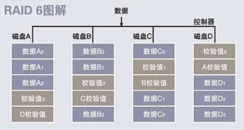 這樣一來,等於每個數據塊有了兩個校驗保護屏障(一個分層校驗,一個是總體校驗)。但是,由於增加了一個校驗,所以寫入的效率較RAID5還差,而且控製係統的設計也更為複雜,此外第二塊的校驗區也減少了有效存儲空間。