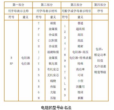 在電子電路中常用的電阻有固定式電阻和電位器,根據SJ-73標準規定,電阻器、電位器的命名由四部分組成:第一部分主稱,第二部分材料,第三部分分類特征,第四部分序號(不適用敏感電阻)。