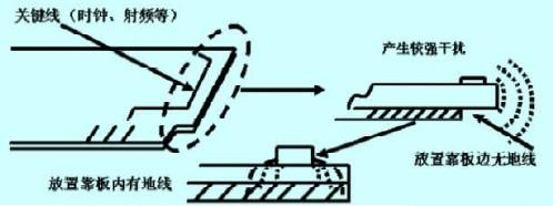 印製電路板的板邊處理是否合理, 決定著是否能夠更加有效地抑製信號的對外幹擾。為防止高速數字電路通過板邊對外幹擾, 應該嚴格控製其布線位置, 讓其盡量靠近印製板內部。高頻等幹擾較強信號線不應該走到板的邊緣, 以防止無對應地層耦合回路, 產生信號對外的幹擾泄漏, 如圖3 所示: