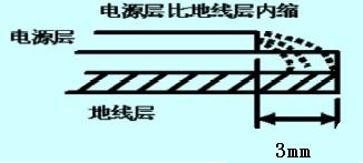 對於高速數字電路板應該采用多層板, 以減小環路麵積, 將中間層作為電源或地層, 並且盡量保證電源與地相鄰的層間距盡量小;讓每一信號層都有一對應的地線層, 信號線與其地回路構成的環麵積要盡可能小, 環麵積越小, 對外的幹擾越少。針對這一特點, 在地平麵分割時, 要考慮到地平麵與重要信號走線的分布, 防止由於地平麵開槽等帶來的問題,信號線不能跨越地平麵和電源平麵分隔區, 防止形成大的地線回路。同時電源層應該比地線層內縮3 m m 左右的距離, 這樣將能夠抑製70% 以上的電源幹擾。如圖2 所示。