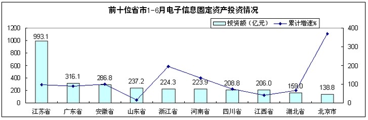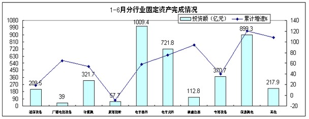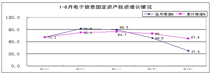 上半年,電子信息產業500萬元以上項目完成投資3960億元,規模接近去年前三季度水平,同比增長67.6%,高於去年同期26.6個百分點,高於同期工業投資40.7個百分點。自二季度起,投資增速高位回落,6月份增速(37.5%)比4、5月份分別回落52和31.4個百分點。