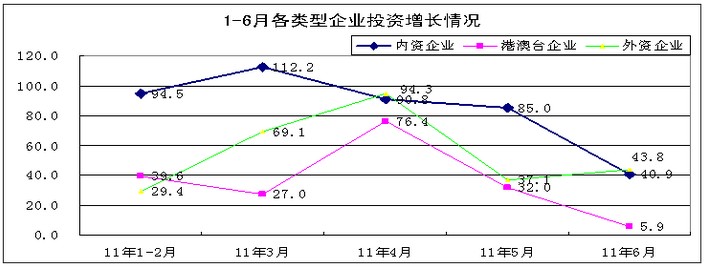 港澳台企業完成投資401億元,同比增長32.6%,低於全行業35個百分點,其中6月份增長5.9%,比5月回落26.1個百分點。外商投資企業完成投資613億元,同比增長50.1%,6月份增長43.8%,高於5月份增速6.7個百分點。