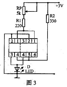 光電耦合器檢測電路如圖3所示,可將TLP621等四個引腳的光電耦合器插入插座左端的四個引腳的插孔中,將TLP332等六個引腳的光電耦合器插入插座右端的六個引腳的插孔中。接通電源後,電源經RP、R1給IC中的發光二極管提供一個正向電壓,發光二極管發光,使IC中的光電三極管導通,3腳外接的發光二極管D發光,若調節RP時,發光二極管的亮度能跟著變化,則被測光電耦合器是好的。