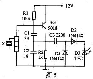 石英晶振檢測電路如圖5所示,BG與C1、C2、石英晶振X等組成高頻振蕩電路,C3、D1和D2組成二倍壓整流電路。將被測石英晶振插入插孔中,接通電源後,若發光二極管D3能持續發光,則被測石英晶振是好的。