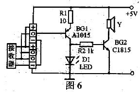紅外線遙控接收器和紅外線遙控發射器的檢測電路如圖6所示。圖中Y是直徑為1cm,高為1cm左右的圓柱形小體積蜂鳴器,插孔的標號“+”、“-”表示遙控接收器的電源端,“o”表示遙控接收器的信號輸出端。若檢測一體化的三端紅外線遙控接收器,將被測遙控接收器的3隻引腳插入對應的插孔中,接通電源,用一隻好的紅外線遙控發射器對著遙控接收器,按住遙控發射器的任意按鍵時,若D1能閃爍發光,同時蜂鳴器Yfasheng,zebeicehongwaixianyaokongjieshouqishihaode。ruoyaojiancehongwaixianyaokongfasheqidehaohuai,yaojiangyizhihaodehongwaixianyaokongjieshouqicharuchazuozhong,anxiabeicehongwaixianfasheqiderenheanjianshi,faguangerjiguanD1都能閃爍發光,同時蜂鳴器發聲,則被測紅外線遙控發射器是好的。