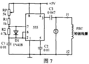 行輸出變壓器檢測電路如圖7所示,555集成定時器與外接元件構成多諧振蕩器。調節RP可產生12.5~25kHz的方波脈衝,由3腳經C3耦合輸出作為FBT初級線圈電諧振的激勵脈衝,C3與FBT初級線圈組成一串聯諧振電路。