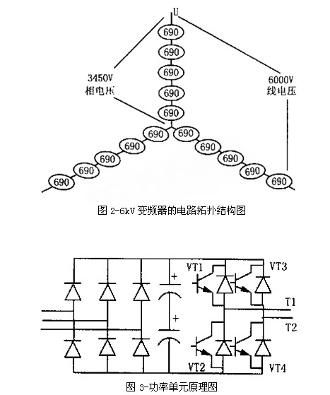 單元串聯多電平PWM電壓源型變頻器,采用若幹個低壓PWMbianpingonglvdanyuanchuanliandefangshishixianzhijiegaoyashuchu,gaibianpinqiduidianwangxiebowuranxiao,xieboshurudianliuhendi,shurugonglvyinshugao,bubicaiyongshuruxiebolvboqihegonglvyinshubuchangzhuangzhi。ruyi6kV的輸出電壓等級為例(如圖2),電網電壓經過二次側多重化的隔離變壓器降壓後向功率單元供電,功率單元為三相輸入、單相輸出的交一直一交PWM電源型逆變器結構。將相鄰功率單元的輸出端串接起來,形成Y聯結構,實現變壓變頻的高壓直接輸出,供給高壓電動機。