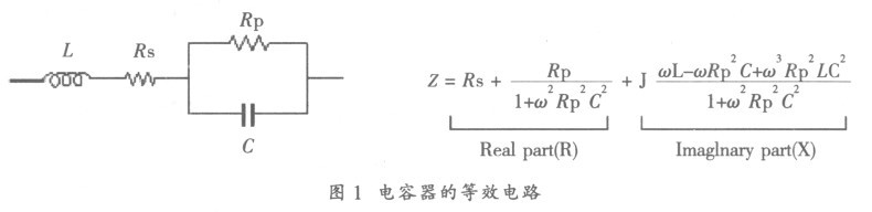 電容器的典型等效電路如圖1 所示, 在該電路中, 電容量C 是電容器的主要成分, Rs 和L 是引線和電極中存在的寄生參數, Rp 代表兩個電極間的寄生泄漏參數。