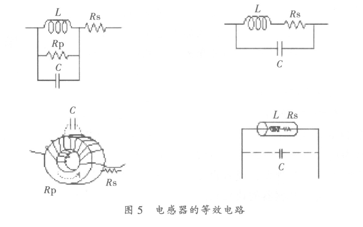 電感器由纏繞在磁芯上的導線構成, 其特性則由所使用的磁芯材料決定。空氣是構成電感器最簡單的磁性材料, 但為使電感器具有更高的電感量,經常用鐵、鐵氧體等磁性材料做磁芯。電感器的典型等效電路如圖5 (a) 所示, 圖中Rp 代表磁性的鐵耗, Rs 代表導線的銅耗, C 是繞線間的分布電容。對於低值電感應使用圖5 (b) 所示的等效電路。由於L 值很小, 繞組間的分布電容就成了主要的影響因素。