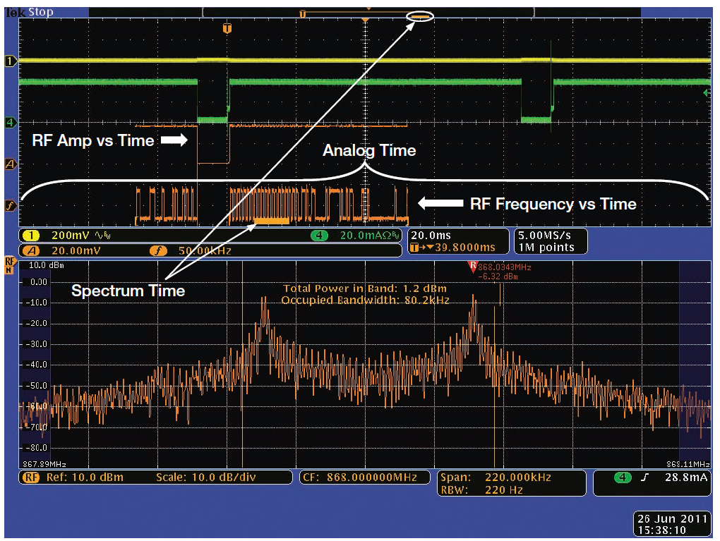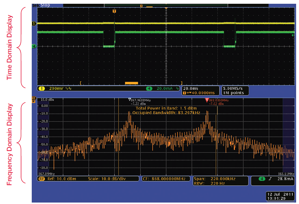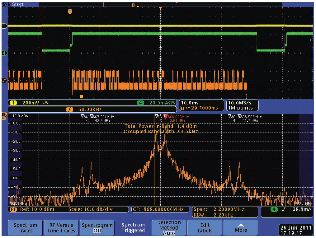 我們測量以868 MHz為中心的無線電頻譜,其擁有相當低的2 kbps的FSK調製數據速率,以供參考。圖2顯示了參考頻譜。注意MDO同時顯示時域視圖和頻域視圖,所有信號都時間相關。[page]
