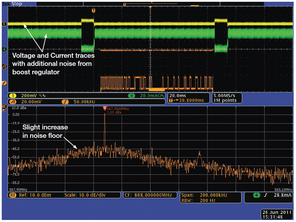 圖6. 使用升壓轉換器的電源和電路板噪聲。