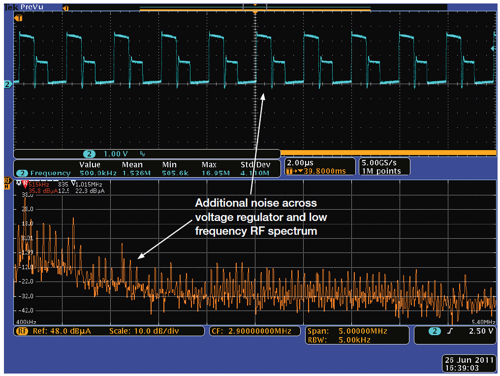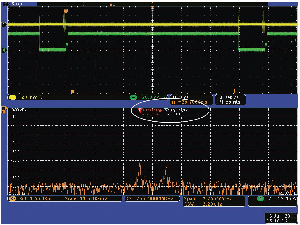 MDO能neng夠gou查zha看kan時shi間jian相xiang關guan的de信xin號hao,幫bang助zhu設she計ji人ren員yuan高gao效xiao診zhen斷duan和he測ce試shi電dian源yuan和he其qi它ta噪zao聲sheng影ying響xiang。它ta能neng夠gou確que認ren正zheng確que設she置zhi發fa送song到dao無wu線xian電dian的de數shu據ju命ming令ling,並bing能neng夠gou檢jian查zha來lai自zi發fa射she機ji和he其qi它ta電dian路lu的de雜za散san輻fu射she。它ta可ke以yi用yong來lai測ce量liang高gao達da6 GHz的RF信號,另外還可以通過時間相關的采集,查看來自開關電源和數字電路的低頻噪聲。
