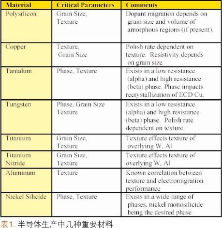 表1總結出半導體生產中可以通過X射線衍射量測的多晶材料。幾種有代表性的應用技術在下麵詳細列出。