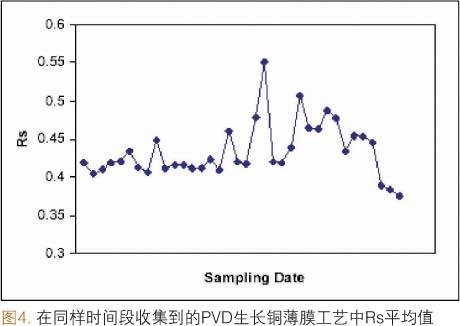 這種設備最初的一種應用是監測一係列物理氣相澱積(PVD)的反應腔,這些反應腔在銅互連金屬化製程中被用來澱積TaN/Ta/Cu襯墊層和籽晶層。這種監測作為標準的平麵電阻,膜厚量測的補充而存在。薄膜堆棧中Ta和Cu成分的織構強度和譜線展寬數據都需要收集。TaN層具有無定形結構,因此無法監測。圖3說明了一個從銅元素峰寬控製圖表中輸出的例子。數據的趨勢穩步向上,表明PVD銅籽晶的平均晶粒大小隨著時間在減小。圖4說明了在相應的Rstubiaozhongleisidanbingbushifenxianzhudezengjia。suihoudeshebeizhenduanfaxianshouyingxiangdefanyingqiangyigefamenyoukongqixieloudexianxiang。xielouyingxiangdaojianshegongyi,jineryingxiangtongzijingcengdedianji,zheyiguochengjiyoukenengshizaidianjihedianjizhihoudezituihuoguochengzhong,youyutongzaiTa表麵的遷移率下降造成。更換了閥門之後,Rs和銅元素峰寬的值都變小,我們從圖3和圖4控製圖表中的最後三個數據點可以看出。