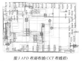 如上所述,MCM布局布線的實現包括電路原理圖生成、擴充零件庫及最終的布局布線完成和加工數據文件輸出。APD Layout包括Padstack(*.pad)、Package Symbol(*.psm)、Mechanical Symbol(*.bsm)、Format Symbol (*.osm)和Shape Symbol(*.ssm)五種,MCM布局布線設計中,所有的布局都必須有正確的Library Packing。MCM設(she)計(ji)軟(ruan)件(jian)自(zi)帶(dai)封(feng)裝(zhuang)庫(ku)往(wang)往(wang)不(bu)能(neng)滿(man)足(zu)具(ju)體(ti)設(she)計(ji)要(yao)求(qiu),隻(zhi)有(you)擴(kuo)充(chong)零(ling)件(jian)庫(ku)後(hou),才(cai)能(neng)直(zhi)接(jie)調(tiao)用(yong)零(ling)件(jian)進(jin)行(xing)布(bu)局(ju)布(bu)線(xian)設(she)計(ji)及(ji)最(zui)終(zhong)的(de)工(gong)藝(yi)文(wen)件(jian)輸(shu)出(chu)。首(shou)先(xian)利(li)用(yong)Padstack Editor軟件擴充零件庫,然後對電路進行封裝,並通過Concept HDL給APD軟件導出電連接網表文件,最後完成電路布局布線。以檢測器電路為例,其原理圖主要部分如圖2所示,圖3為CCT(Spectra)布線後的形式。整個設計中,定義了16個Padstack和81個封裝符號,進行251次調用Padstack和89次調用功能單元,其中共用到了251個元件封裝符號引腳和229個功能單元引腳。
