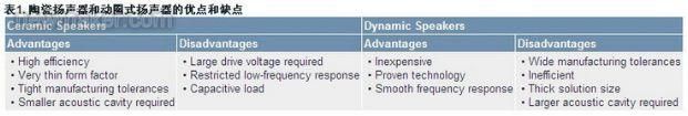 如今的便攜式設備需要更小、更薄、gengshengdiandedianziyuanqijian。duiyushejixiaoqiaodeshouji,dongquanshiyangshengqichengweilezhizaoshangnengfoushengchanchuchaoboshoujidezhiyueyinsu。zaizheyixuqiudetuidongxia,taocihuoyadianyangshengqixunsuxingqi,chengweidongquanshiyangshengqidetidaifangan。taociyangshengqinengyichaobo、緊湊的封裝提供極具競爭力的聲壓電平(SPL),具有取代傳統的動圈式揚聲器的巨大潛力。動圈式揚聲器和陶瓷揚聲器的區別如表1所示。