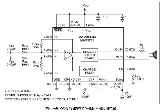 圖4中的MAX9788采用一個片上電荷泵產生與VDD相反的負電源電壓。當輸出信號需要高壓驅動時,負電源電壓作用於輸出級。MAX9788提供了一種驅動陶瓷揚聲器的優化方案,比采用AB類放大器和升壓轉換器的傳統方案更高效。