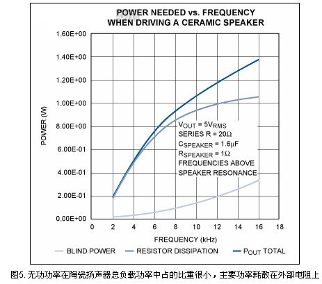 驅動10Ω串聯電阻的陶瓷揚聲器時,總負載功率中無功功率占的比重並不大。大部分功率耗散在外部電阻上,圖5為放大器功率與頻率的關係曲線。