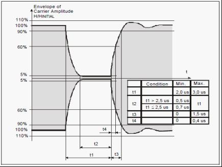13.56MHz高頻RFID係統是目前國內應用最為廣泛,技術較為成熟的射頻識別係統。相關的國際標準對射頻發射頻率、信道帶寬、發射功率等參數都有明確的要求,特別是RF信號的幅度(功率)隨時間變化的情況,標準有著嚴格的規定。以讀寫設備為例,讀寫設備發出的載波信號的幅度變化時間,必須符合ISO18000-3標準對於t1-t4的時間限製。