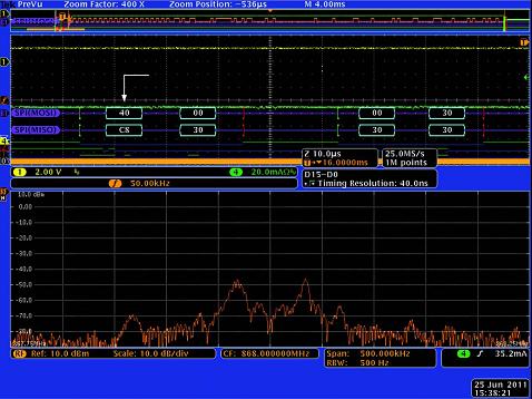 在調試RFID係xi統tong時shi,工gong程cheng師shi麵mian臨lin的de一yi個ge重zhong要yao的de困kun難nan是shi如ru何he測ce量liang標biao簽qian的de返fan回hui信xin號hao。由you於yu標biao簽qian返fan回hui信xin號hao的de幅fu度du很hen小xiao,使shi用yong普pu通tong的de示shi波bo器qi往wang往wang難nan以yi捕bu獲huo這zhe一yi信xin號hao,更geng不bu要yao說shuo對dui其qi幅fu度du和he頻pin率lv做zuo進jin一yi步bu分fen析xi了le。主zhu要yao原yuan因yin是shi普pu通tong示shi波bo器qi的de動dong態tai範fan圍wei隻zhi有you40dB,無法捕獲微弱的標簽信號。MDO4000具有60dB的動態範圍,以及低至-152dB/Hz 的底噪,能夠很好地勝任同時捕獲讀寫器信號和標簽信號的任務。其獨特的AvsT射頻信號幅度的時域波形功能,甚至可以顯示標簽信號幅度變化過程。