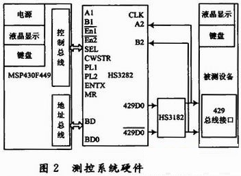 接口的實現方式選用Intersil公司的HS3282芯片,它支持ARINC429通信規範和其他串行數據傳輸協議,采用+5 V供電。具有兩路接收、一路發送的功能。通道接收器之間也是獨立的並行接收,可以直接連接到ARINC429總線,而不需電平轉換。使用時和HS3182總線驅動器配合,就可以發送數據進行二級差分驅動,產生ARINC429總線的電平。HS3282數據總線為16位,MSP430F449為16位單片機,從而避免了8位單片機為解決係統總線匹配的問題需要采用鎖存器作為虛擬總線的煩惱,提高了測控係統的可靠性。