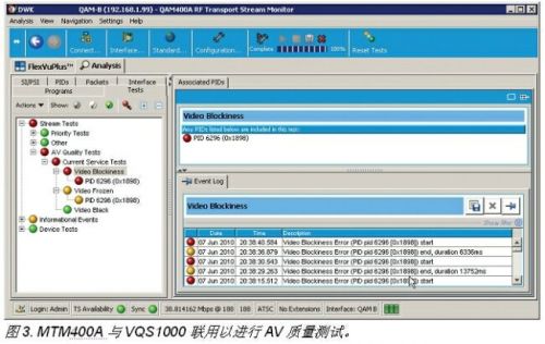 除了附加有視頻PID帶寬測量以外,VQS1000的顯示和操作幾乎與MTM400A的文件模式應用一樣。VQS1000的另一項功能是當它與MTM400A聯用時,所有的觸發均通過SNMP返回到MTM400A。此外,還有一項測試稱為AV質量測試也是很有用的,如圖3所示,MTM400A可以跟蹤VQS1000黑幀、凍結幀和塊效應測量的觸發事件。