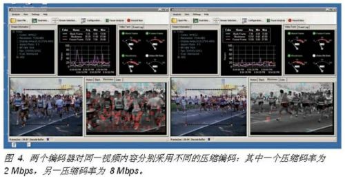 下麵的例子是從交換機處將兩個多播流送入到VQS1000服務器。這兩個會話來自兩個不同的視頻編碼器,但看起來仍為同一實際視頻。其中第一個編碼器的編碼速率為2Mbps,而另一個編碼器的編碼速率為8Mbps。圖4表示的是VQS1000應用程序對兩個會話同時測量的兩個拷貝。這兩項測量均是實時進行的,在圖4的並列顯示中給出了它們的測量結果。容易看出,碼率為2Mbps的視頻圖像質量較差,有著較高的塊效應讀數,而碼率為8Mbps的視頻有著相對平緩的塊效應數值,這和我們預期的結果是一致的。