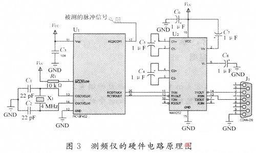 測頻儀的硬件電路主要包括兩個方麵:頻率測量電路和數據通信電路。頻率測量是指使用PIC18F452的CCP模塊測量外部脈衝信號的頻率;數據通信是指將測量得到的數據通過串口傳至PC機進行處理。測頻儀的硬件電路如圖3所示。