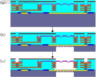 下圖簡述了Post-CMOS MEMS的製造方式。在Post-CMOS MEMS工藝中需特別注意,不能讓額外的熱處理或高溫工藝影響到CMOS組件的物理特性及MEMS的應力狀態,以免影響到振膜的初始應力。鑫創科技公司克服了諸多的技術難題,完全采用標準的CMOS工藝來同時製造電路元件及微機電麥克風結構。在CMOS部分完成後,將芯片的背麵研磨至適當厚度以符合封裝要求。最後,利用氫氟酸溶液(HF)去(qu)除(chu)犧(xi)牲(sheng)氧(yang)化(hua)物(wu)來(lai)釋(shi)放(fang)懸(xuan)浮(fu)結(jie)構(gou)。此(ci)外(wai),在(zai)設(she)計(ji)中(zhong)還(hai)需(xu)考(kao)慮(lv)可(ke)完(wan)全(quan)去(qu)除(chu)犧(xi)牲(sheng)材(cai)料(liao)而(er)又(you)不(bu)損(sun)害(hai)麥(mai)克(ke)風(feng)振(zhen)膜(mo)的(de)蝕(shi)刻(ke)方(fang)法(fa),並(bing)應(ying)避(bi)免(mian)麥(mai)克(ke)風(feng)振(zhen)膜(mo)與(yu)背(bei)電(dian)極(ji)板(ban)之(zhi)間(jian)產(chan)生(sheng)粘(zhan)黏(nian)現(xian)象(xiang)。