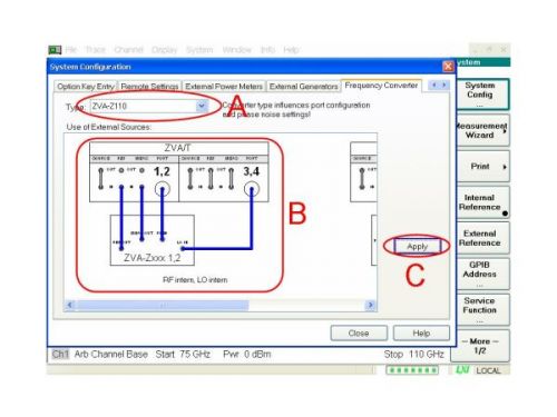 在圖2所示的A、B、C三個區域進行如下測量配置:在A區擇變頻模塊型號,在B區選擇電纜連接方式,在C區點擊應用按鍵並連接變頻模塊到網絡分析儀(見圖 3),然後將頻率軸調節成75GHz到110GHz(見圖2底部)此外,變頻模塊的所有測量參數會被自動設置(例如射頻和本振的倍頻係數、最佳功率電平、複位設置、連接類型WR10,以及定義和選擇波導校準套件R&S ZV-WR10)