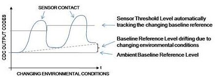 保持可靠性能。容性傳感器電極是采用PCB上的標準銅材料或柔性材料製成的。這種材料的特性會隨溫度和濕度的變化而發生改變。這種變化會使基線電平發生偏移(所有傳感器閾值電平均是以基線電平為參考的)。較大的基線偏移增加了接觸閾值電平過低或過高的風險(過低還是過高取決於基線偏移的方向)這(zhe)會(hui)引(yin)起(qi)虛(xu)假(jia)的(de)接(jie)觸(chu)誤(wu)差(cha),或(huo)使(shi)閾(yu)值(zhi)電(dian)平(ping)不(bu)是(shi)太(tai)靈(ling)敏(min)就(jiu)是(shi)不(bu)夠(gou)靈(ling)敏(min),導(dao)致(zhi)接(jie)觸(chu)狀(zhuang)態(tai)的(de)不(bu)穩(wen)定(ding)。為(wei)保(bao)持(chi)傳(chuan)感(gan)器(qi)原(yuan)始(shi)的(de)信(xin)號(hao)接(jie)觸(chu)閾(yu)值(zhi)檢(jian)測(ce)電(dian)平(ping)餘(yu)量(liang)(靈敏度),CDC需要自動跟蹤基線偏移誤差的幅度,並對閾值設置進行相應的重新調整。圖2中的示例介紹了AD7147和AD7148的閾值電平如何針對因環境條件變化引起的基線失調變化進行自動跟蹤和調整。