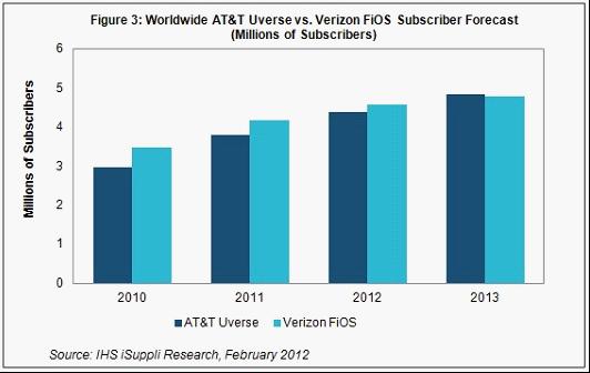據IHS Screen Digest的研究報告,2011年第四季度美國電話電報公司(AT&T)的Uverse服務新增用戶數量,多於對手Verizon的FiOS服務。這是AT&T在競爭激烈的付費電視領域連續第10個季度戰勝Verizon。