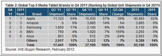 2011年全年,蘋果iPad出貨量為4050萬個,比2010年的1510萬個大增168%。去年蘋果的市場份額為62.0%,低於2010年的87%。在2010年的大部分時間裏,蘋果獨占媒體平板市場。