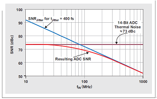讓我們來對一個具有 400 fs 抖動時鍾電路和 ~73 dB 熱噪聲的 14 位 ADC 進行分析。低輸入頻率(例如:10MHz 等)下,該 ADC 的 SNR 主要由其熱噪聲定義。由於輸入頻率增加,400-fs 時鍾抖動越來越占據主導,直到 ~300 MHz 時完全接管。盡管相比 10MHz 的 SNR,100MHz 輸入頻率下時鍾抖動帶來的 SNR 每十倍頻降低 20dB,但是總 SNR 僅降低 ~3.5 dB(降至 69.5dB),因為存在 73-dB 熱噪聲(請參見圖 5):