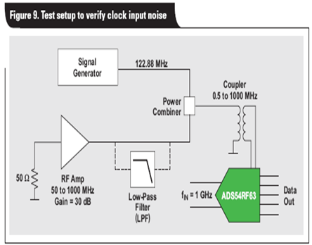 若想要驗證時鍾相位噪聲是否需要整合至時鍾輸入帶寬,則需建立另一個實驗。ADS54RF63 再次工作在 122.88 MSPS,其輸入信號為 1GHz,以確保 SNR 抖動得到控製。我們利用一個 RF 放大器,生成 50MHz 到 1GHz 的寬帶白噪聲,並將其添加至采樣時鍾,如圖 9 所示。之後,我們使用幾個不同低通濾波器 (LPF) 來限製添加至時鍾信號的噪聲量。