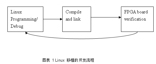 使用者開始進行Linux移植到晶心平台,首先須先選定一版晶心的Linux原始碼作為基準再進行軟件移植,修改原始碼以符合使用者的開發平台,經由工具鏈的compile與link所產生的Linux的映像文件,再放到FPGA板上以驗證程序編寫的正確與否,依此開發程序:軟件編寫->FPGA板驗證,再回到軟件編寫程序直到所有周邊IP在FPGA板上驗證完全,Linux 移植才完成,如圖表 1所示,Linux移植過程中,AICE調試可以有效加快Linux移植的速度。