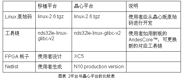 移植平台是指使用者要移植Linux的平台,也就是移植Linux的目標平台。將移植平台與晶心平台的比較列表如下: (其中所列之軟件皆屬於BSP310中之套件)。