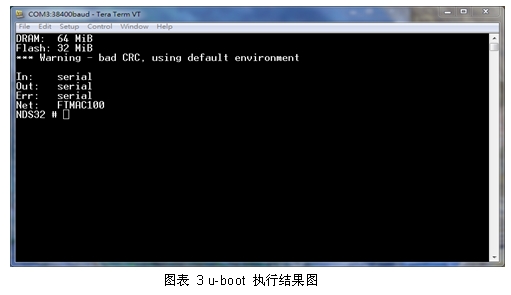 patch 完成的u-boot source code 可以產生ROM版的u-boot image,直接開機後的執行結果如圖表3所示。