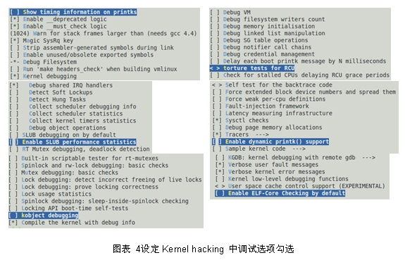 Linux Kernel 需要設定一些調試選項,才能順利的運用AndeSoft™的GDB進行調試。晶心平台中Linux kernel 調試選項設定如圖表4所示,增加這些選項會增加kernel 映像文件的空間,如果空間占用過大以至於不符合設計需求時,可在調試工作完畢後將調試選項關閉以節約不必要的空間浪費。