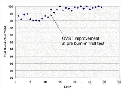 圖2超負載試驗後良率隨時間變化的情況,以及實施測試改進後良率的提高情況