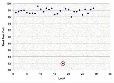 圖4最終測試良率(超負載試驗前)和標出不符合統計良率限值的點的示例圖。該點是一個異常值,是要求進一步篩選和分析的風險點,也可能會出現不合格品。