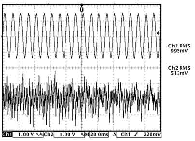 常見的音源,包含樂音和語音,其RMS值往往比峰值輸出功率低得多。通常情況下,語音的峰值與RMS功率之比(即波峰因數)為12dB,而樂音的波峰因數為 18~20dB。圖1為時域內音頻信號和正弦波的波形圖,給出了采用示波器測量兩者RMS值的結果。雖然音頻信號峰值略高於正弦波,但其RMS值(zhi)大(da)概(gai)隻(zhi)有(you)正(zheng)弦(xian)波(bo)的(de)一(yi)半(ban)。同(tong)樣(yang),音(yin)頻(pin)信(xin)號(hao)可(ke)能(neng)存(cun)在(zai)突(tu)變(bian),但(dan)正(zheng)如(ru)測(ce)量(liang)結(jie)果(guo)所(suo)示(shi),其(qi)平(ping)均(jun)值(zhi)仍(reng)遠(yuan)低(di)於(yu)正(zheng)弦(xian)波(bo)。雖(sui)然(ran)音(yin)頻(pin)信(xin)號(hao)可(ke)能(neng)具(ju)有(you)與(yu)正(zheng)弦(xian)波(bo)相(xiang)近(jin)的(de)峰(feng)值(zhi),但(dan)D類lei放fang大da器qi表biao現xian出chu來lai的de熱re效xiao應ying卻que大da大da低di於yu正zheng弦xian波bo。因yin此ci,測ce量liang係xi統tong的de熱re性xing能neng時shi,最zui好hao使shi用yong實shi際ji音yin頻pin信xin號hao而er非fei正zheng弦xian波bo作zuo為wei信xin號hao源yuan。如ru果guo隻zhi能neng使shi用yong正zheng弦xian波bo,則ze所suo得de到dao的de熱re性xing能neng要yao比bi實shi際ji係xi統tong差cha。