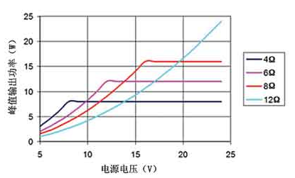D 類放大器MOSFET輸出級的導通電阻會影響它的效率和峰值電流能力。降低負載的峰值電流可減少MOSFET的I2R損耗,進而提高效率。要降低峰值電流,應在保證輸出功率, D類放大器的電壓擺幅以及電源電壓的限製的條件下,選擇最大阻抗的揚聲器,如圖4所示。本例中,假設D類放大器的輸出電流為2A,電源電壓範圍為 5~24V。電源電壓大於等於8V時,4Ω的負載電流將達到2A,相應的最大連續輸出功率為8W。如果8W的輸出功率能滿足要求,則可以考慮使用一個 12Ω揚聲器和15V供電電壓,此時的峰值電流限製在1.25A,對應的最大連續輸出功率為9.4W。此外,12Ω負載的工作效率要比4Ω負載的高出 10%~15%。實際效率的提高根據不同D類放大器而異。雖然大多數揚聲器的阻抗都采用4Ω或8Ω,但也可采用其他阻抗的揚聲器實現更高效的散熱。